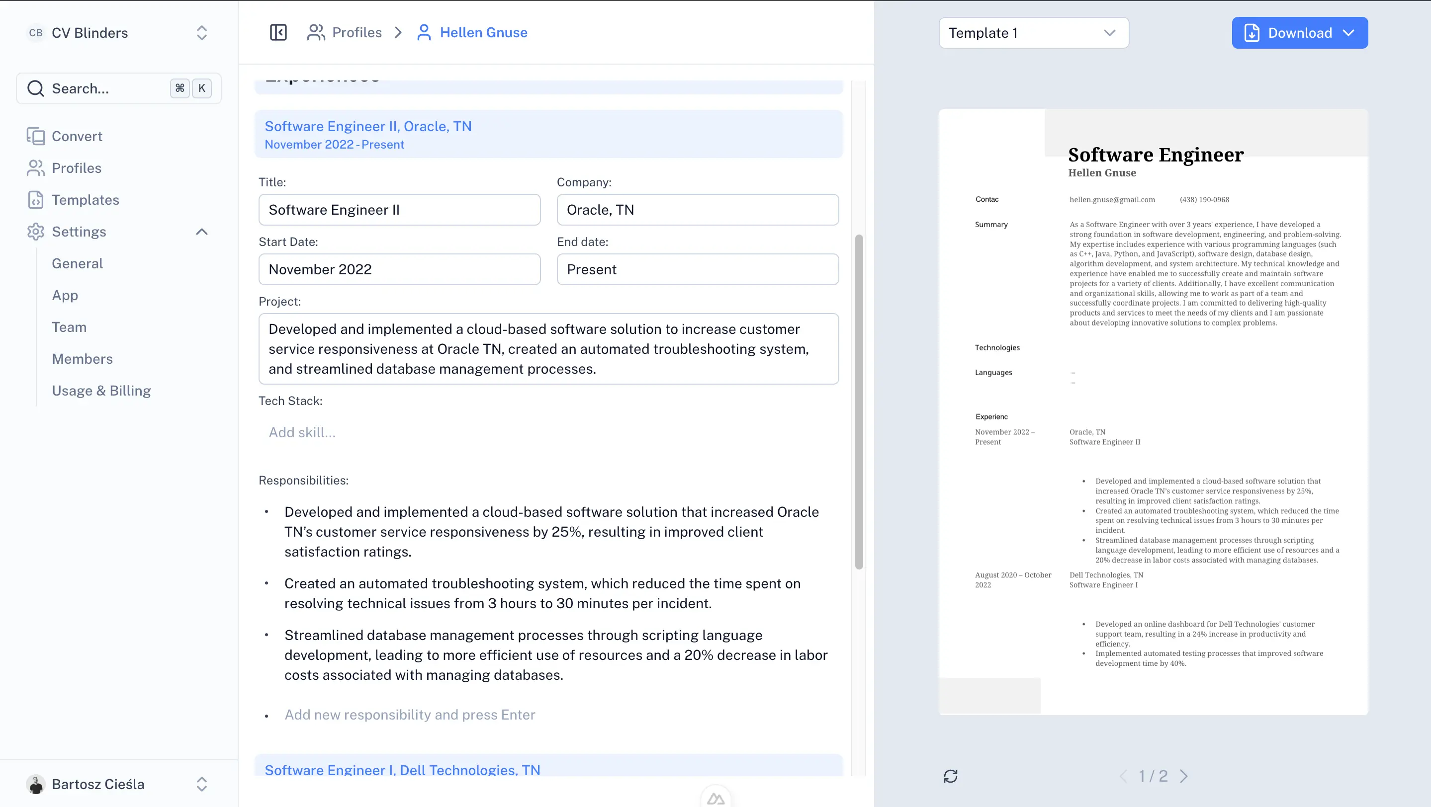 Most parsers stop at raw data. CV Blinder goes further by generating ready-to-use profiles directly in your company template.