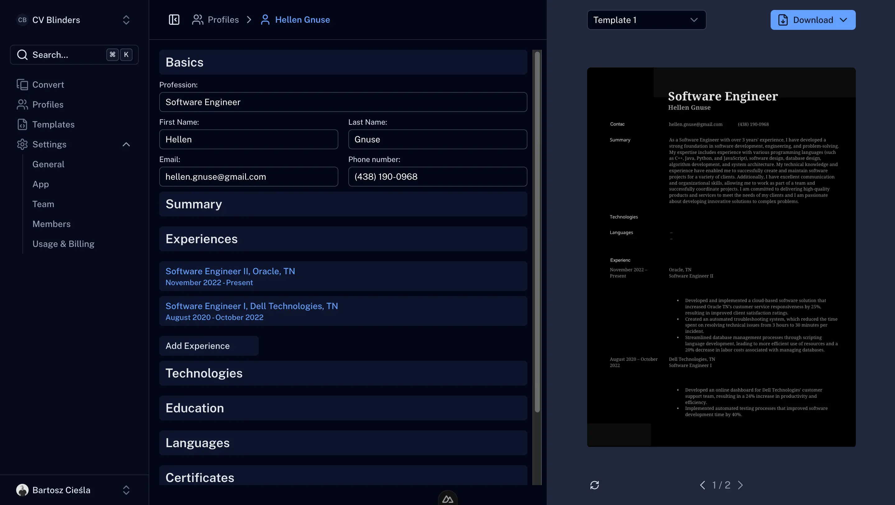 Most parsers stop at raw data. CV Blinder goes further by generating ready-to-use profiles directly in your company template.